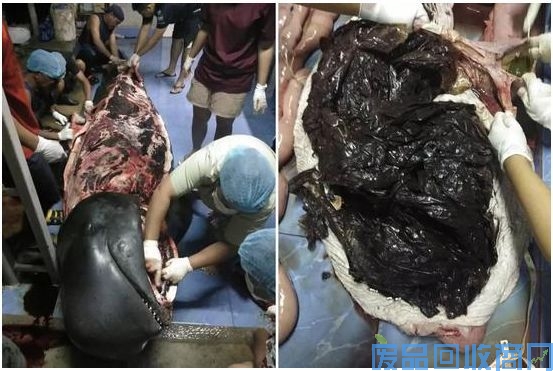 图:误食80个塑料袋(重达8千克)死亡的鲸鱼