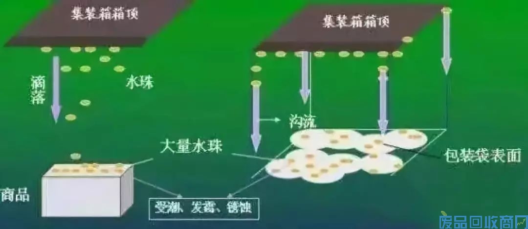 在集装箱远洋运输或存储过程中,货柜往往会经历高温气候及较强的昼夜温差变化,温度变化会在0-8摄氏度,湿度会高达98%,这就是凝露现象,当温度为30度时,空气中水含量为30.4g每平方米。当温度由30摄氏度降低到18摄氏度,水蒸气就会凝结成水滴,若是40英尺货柜则产生1000克的冷凝水,就会造成“集装箱雨”。