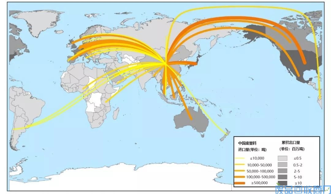 地图改自研究论文:The Chinese import ban and its impact on global plastic waste trade