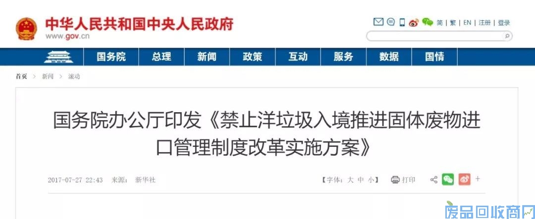 就在这篇文章发表的前一天,国务院办公厅印发了《禁止洋垃圾入境推进固体废物进口管理制度改革实施方案》。根据《方案》的要求,在2017年年底前,要禁止进口生活来源废塑料。