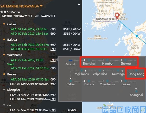 马士基旗下的“SAFMARINE NOKWANDA” 号集装箱经智利的梅希约内斯港、秘鲁的卡亚俄港、巴拿马的巴尔博亚港、日本横滨港,也是于3月2日抵达釜山集装箱码头。目的地则是:上海港、宁波港、蛇口和香港。