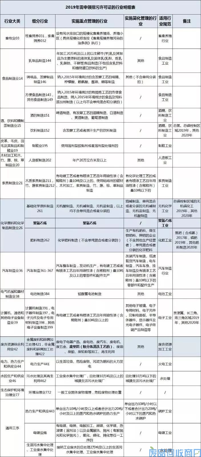 2019年共有15个行业大类的排污单位需要申领排污许可证: