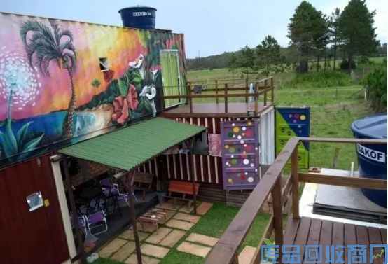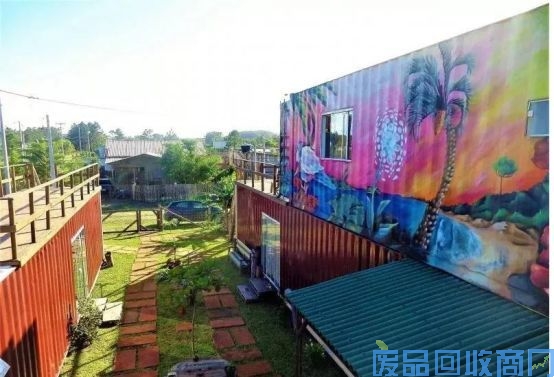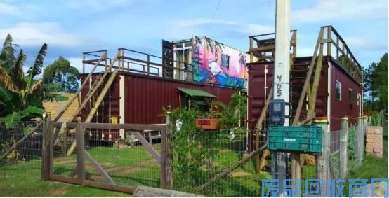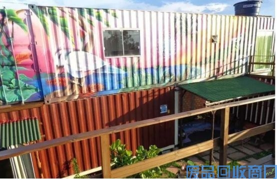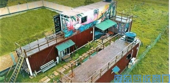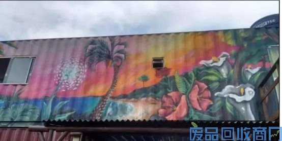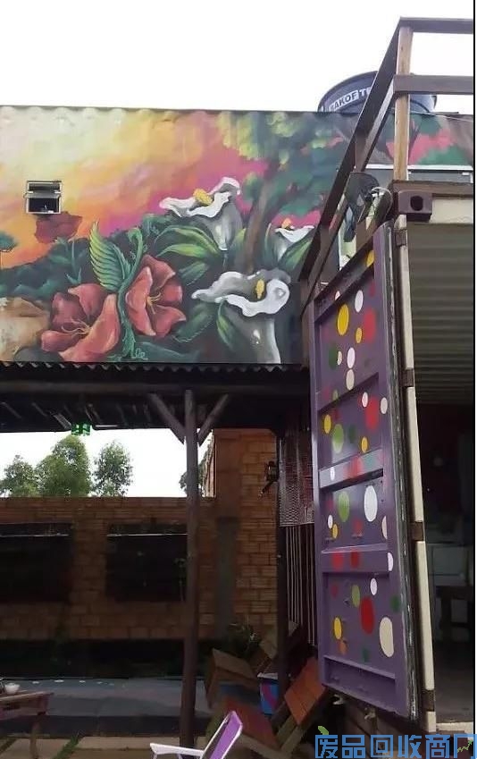 有趣的是,二层集装箱外墙不同于一层的简单喷漆,二层喷涂了很漂亮的涂鸦图案,给这栋集装箱房屋增添了不少的色彩,也丰富了人们的视觉。