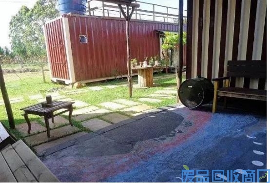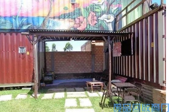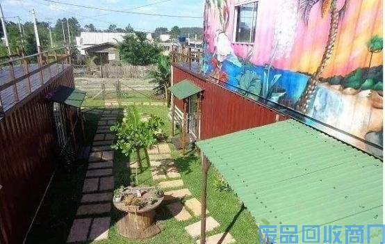 认真看会发现,涂彩绘的集装箱下充分利用空间,设置了简单的休闲空间,利用木材和瓦楞板简单搭建了小凉亭。