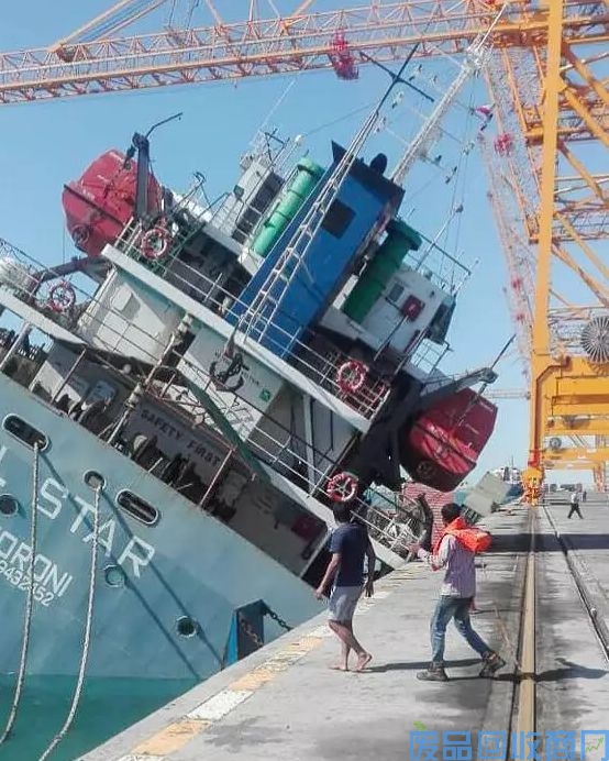 不过这艘船可不是在航行中出的事,而是在港口装货时因操作不当,当场就翻船了......来看现场照片: