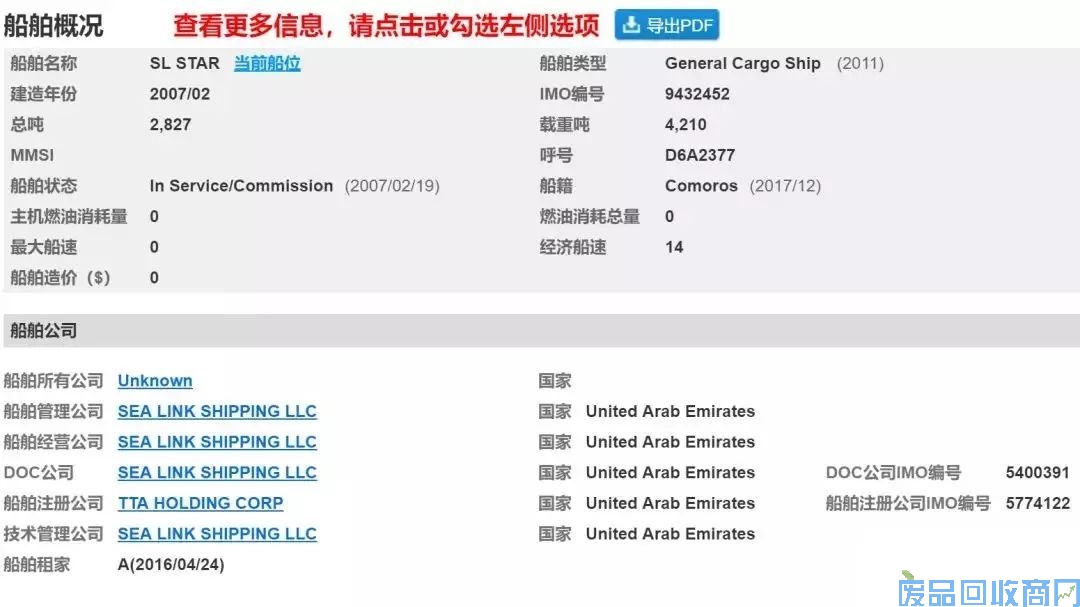具有集装箱容量的普通货船SL STAR,IMO 9432452,dwt 4210,建于2007年,旗帜科摩罗,经理SEA LINK SHIPPING LLC,阿联酋。