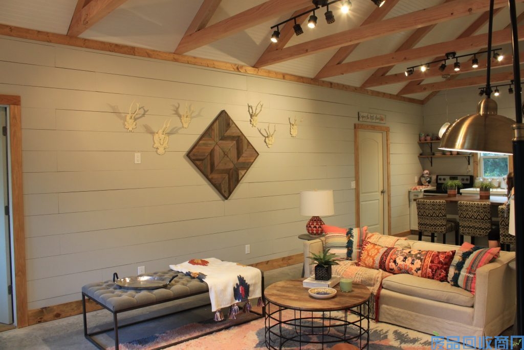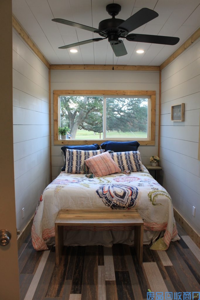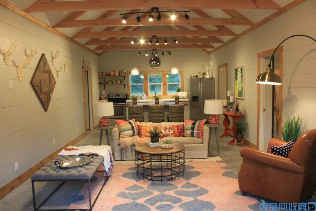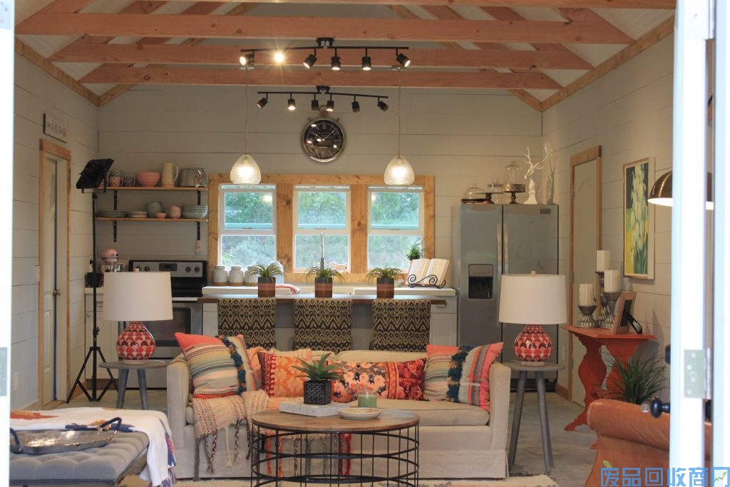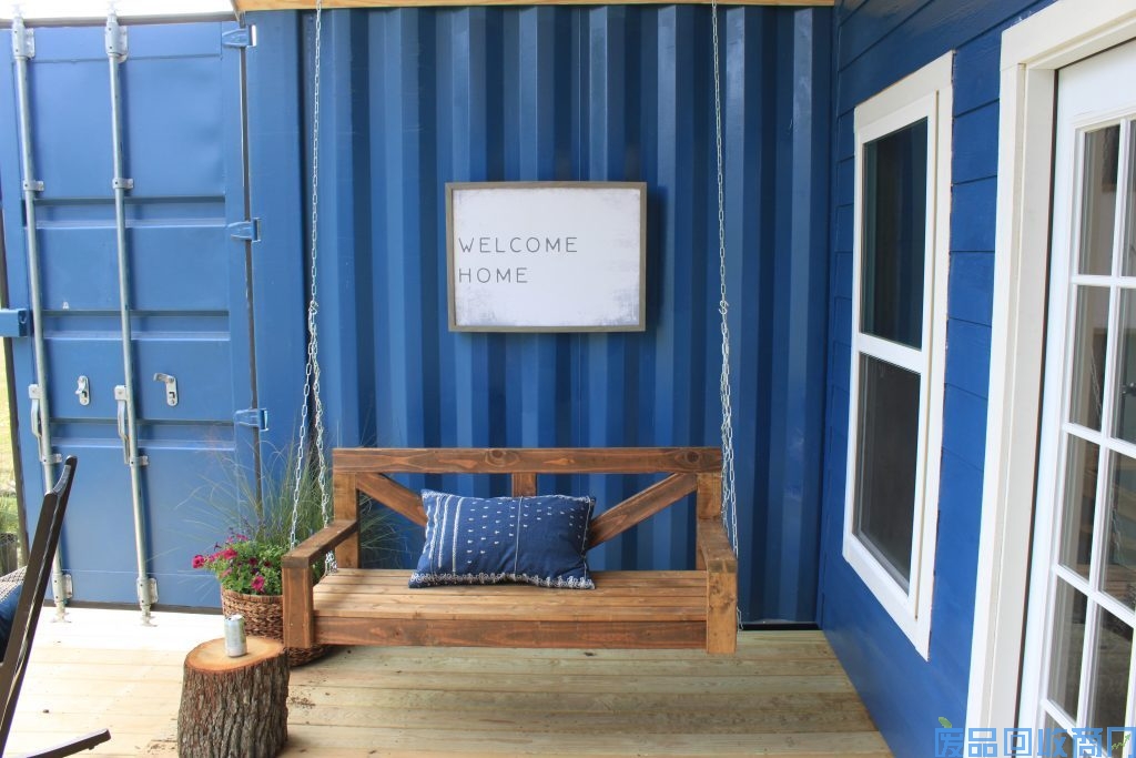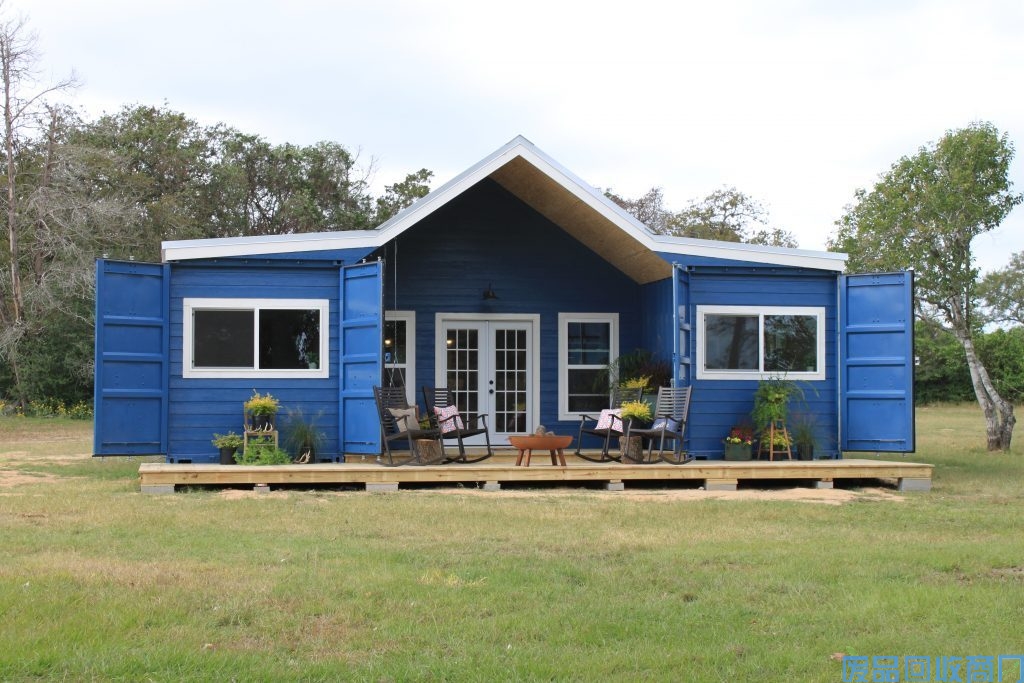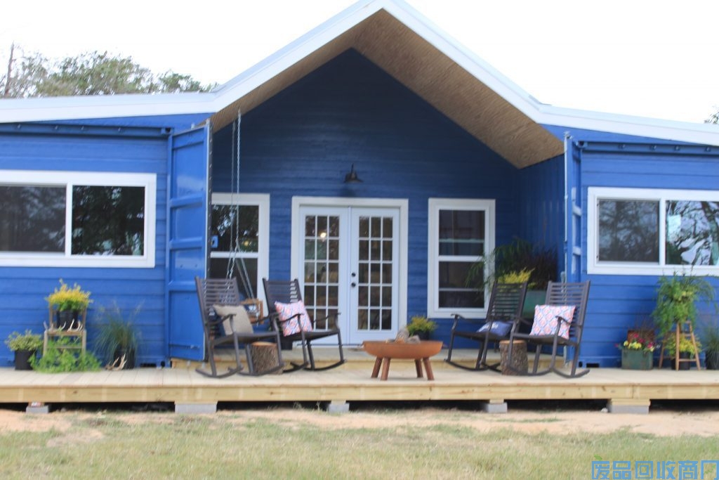 本所集装箱住宅外观设计主色为蓝色,中间包木墙,顶部做了一个三角形,防止屋顶积水,且兼具美观功能。集装箱住宅前后左右大面积开窗,即可保证光线又能屋内循环转化热量。室内整体装修风味走温馨格调。小碎花式的沙发、桌椅、床上用品,更为家里增加了许多温馨的氛围。