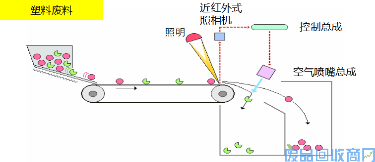 利用近红外线照射废塑料混合料后将信号传至电脑,电脑分辨后控制喷嘴喷出空气,从而将塑料分类。