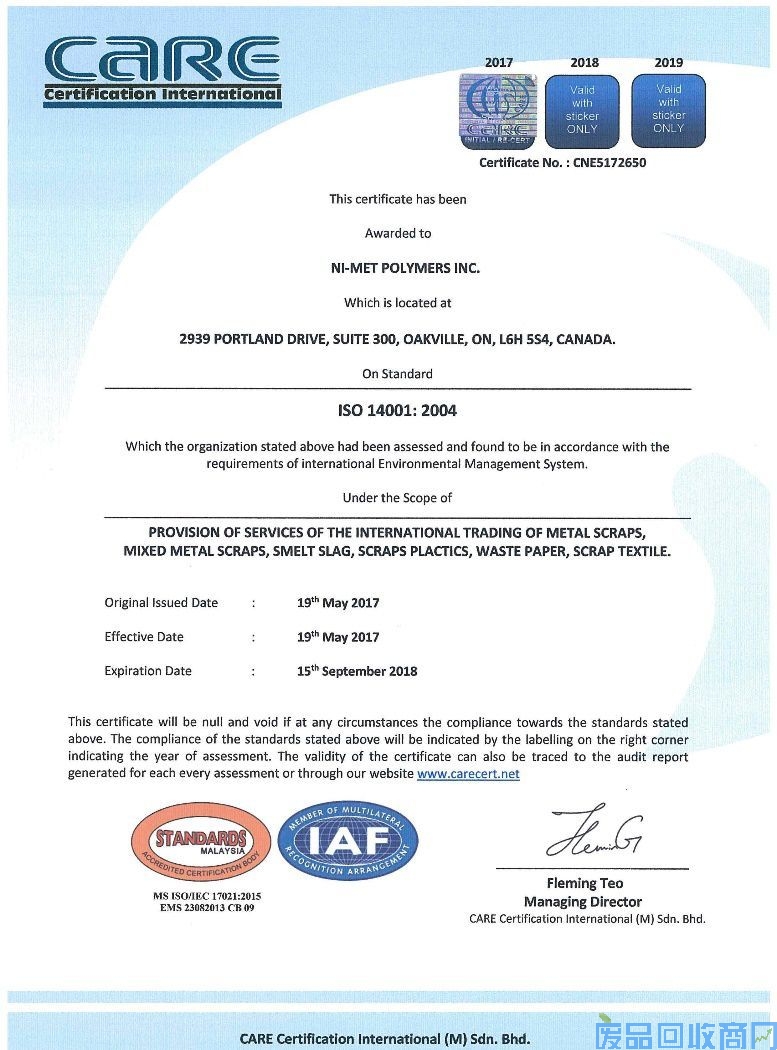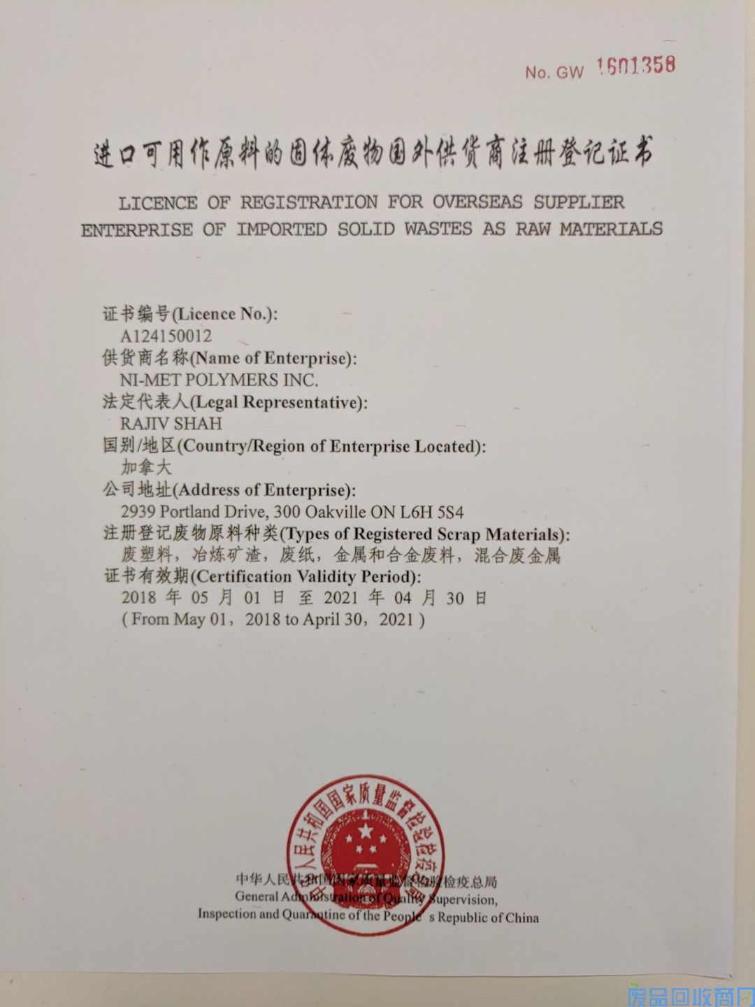 加拿大利美特资源有限公司 (Ni-Met)从2005年开始致力于废旧塑料的回收以及贸易,已通过ISO 9001认证,是美国废料再生工业协会(ISRI)、国际回收局( BIR)和加拿大回收局(CARI)的会员。