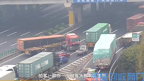 3月21日,杭州某段高速上。一辆货车所载7吨重钢卷在拐弯处突然滚落,当时右侧大货车有意躲避,但是由于距离太近,导致后轮直接撞上钢卷,车子发生侧翻,车上集装箱也倾斜,这时一辆高速行驶的黑色小轿车正穿过倾倒的货车尾部。