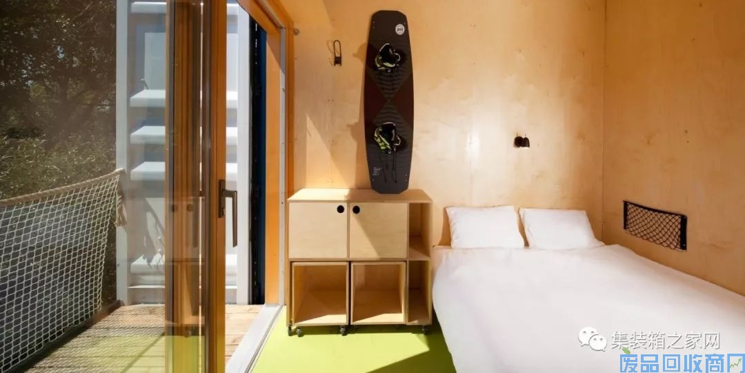蓝色的运输箱突出海洋主题。酒店建筑细部设计,进一步加强了这个主题,比如:圆窗、由绳索和网制成的栏杆等。