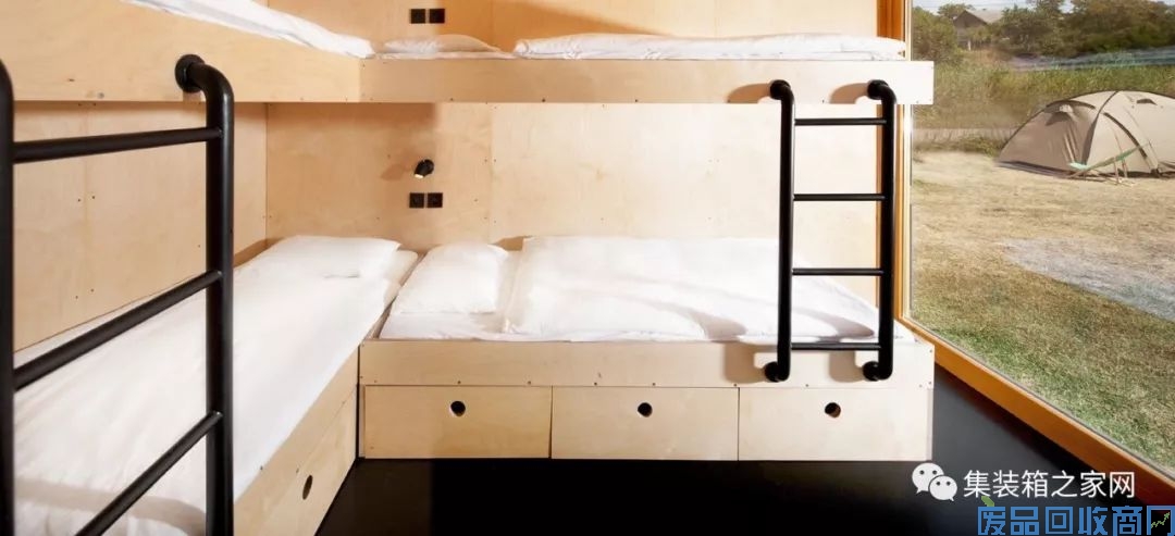 如此简单的集装箱酒店是由ARTIKUL 建筑师事务所设计的,就像图片中看到的那样,建筑主体就是由是三个二手运输箱上下放置构成。但是它却是可以移动的季节性酒店,“自给自足”是它最突出的特点。