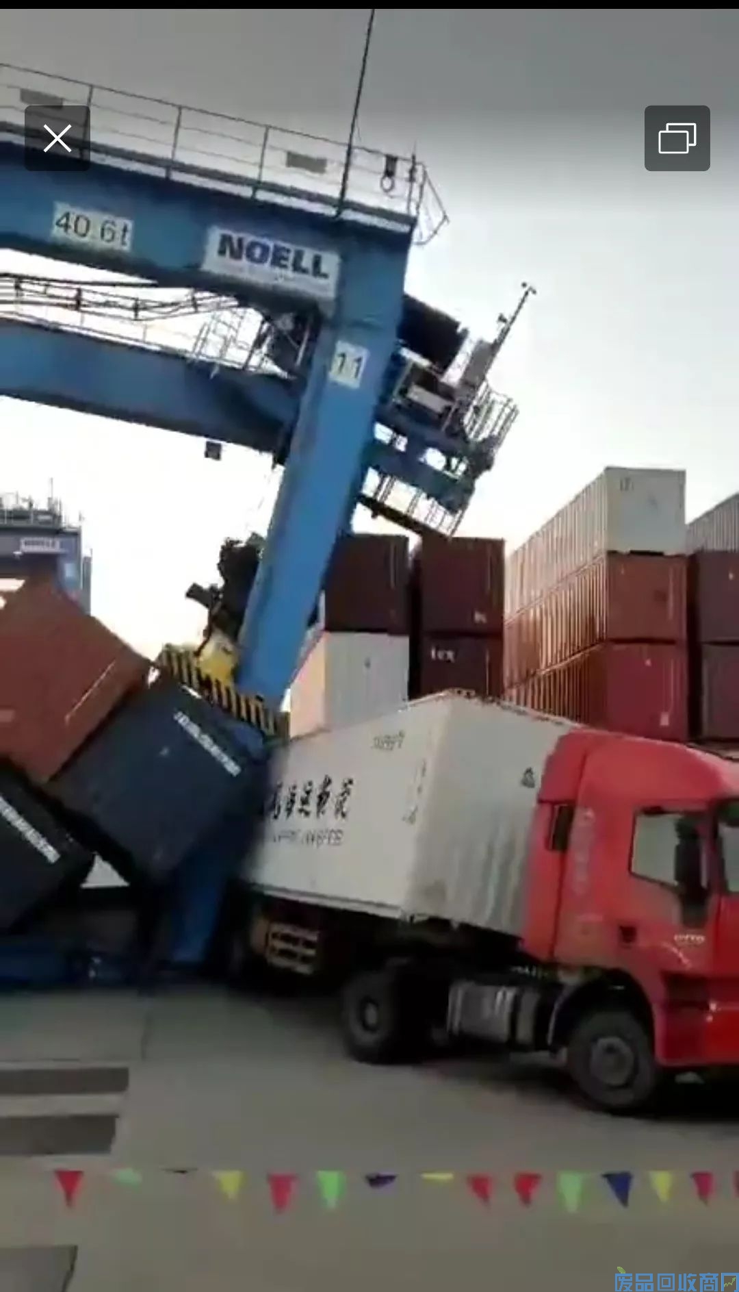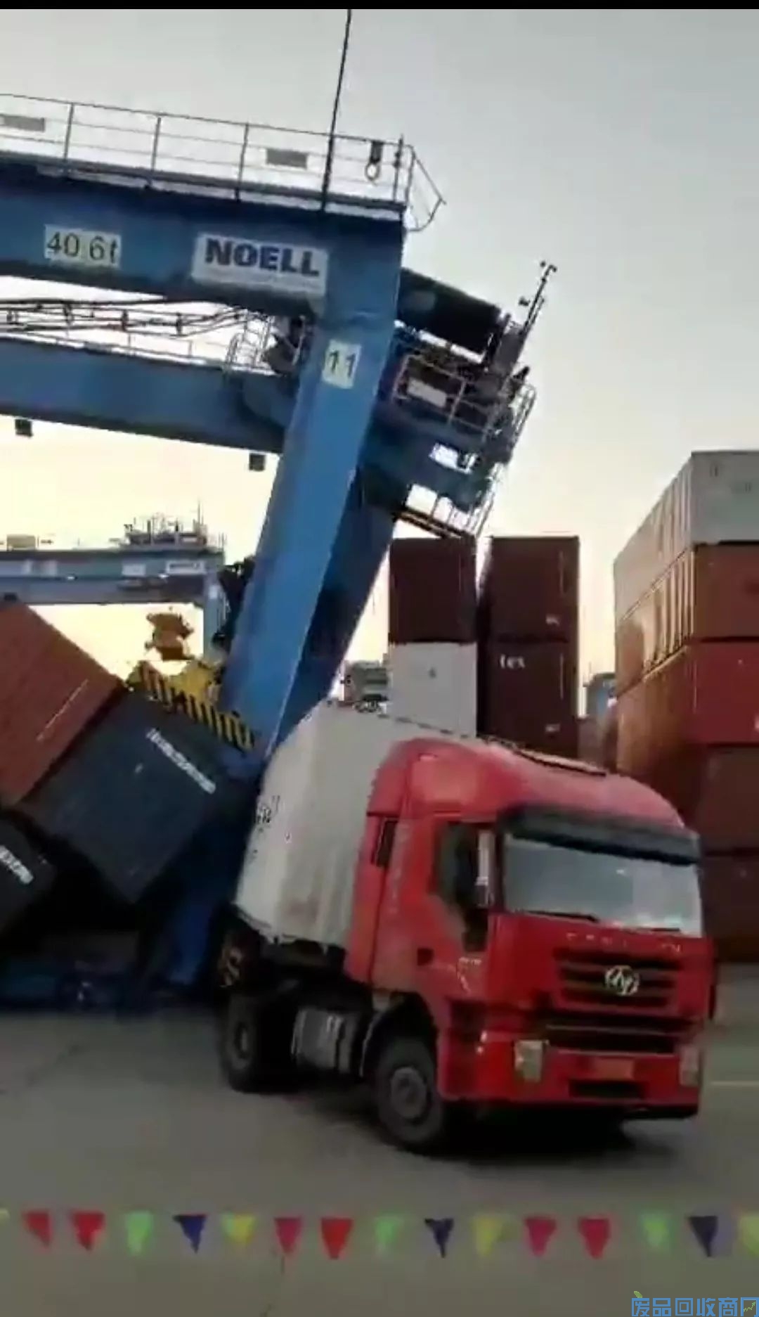 吊机倒塌,集装箱散落一地,拖车被压,先来看一下现场。