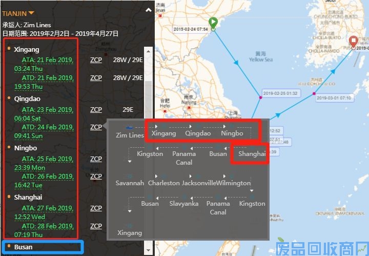 ▲“TIANJIN ”轮船期及挂靠港
