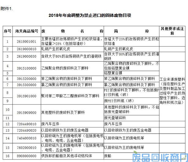 附件:1.2018年年底调整为禁止进口的固体废物目录
