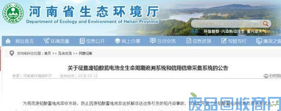 河南省也出台了关于征集废铅酸蓄电池全生命周期追溯系统和信用信息采集系统的公告:要求对每一块废电池从产生、收集、转移、暂存到集中处置全过程能够实现来源可查、去向可追、全程可控,对非法转移、超期贮存等违法违规行为能够实现预警,对经营情况能够统计,并有可持续商业模式。