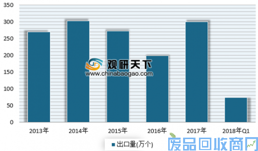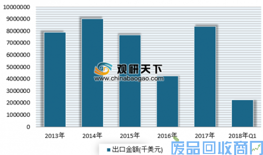 纵观2013-2017年我国集装箱出口量情况,除2016年集装箱出口量急速下滑外,出口量整体波动不大,年均复合增长率为2.67%。2018年一季度中国出口集装箱74万个,同比增长4.5%。2018年1-3月中国出口集装箱金额达到22.63亿美元,同比增长36.1%。