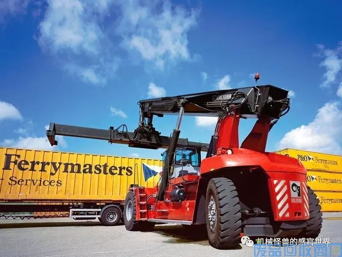 在这五颜六色的集装箱世界里,有搬运40~50吨重载集装箱的科尼(Konecranes)SMV 4531 TB5 正面吊,还有搬运8~10吨空集装箱的卡尔玛(Kalmar) DCD70空箱堆高机