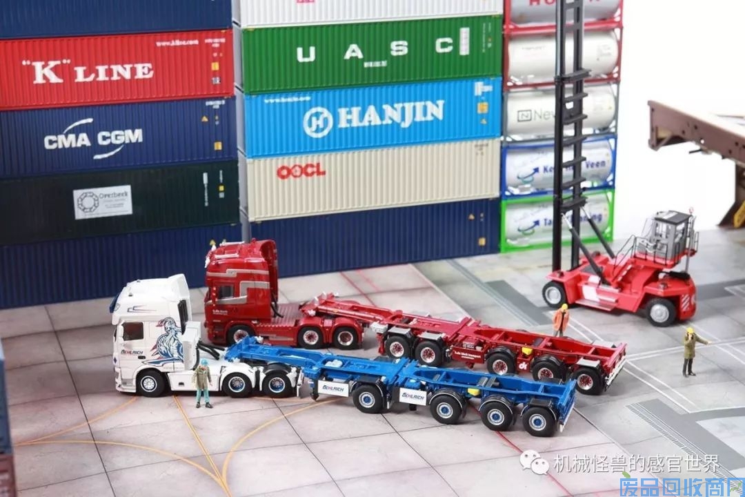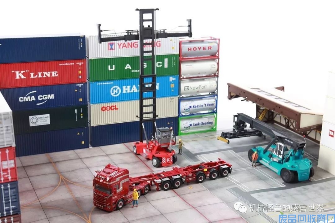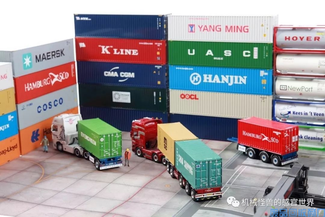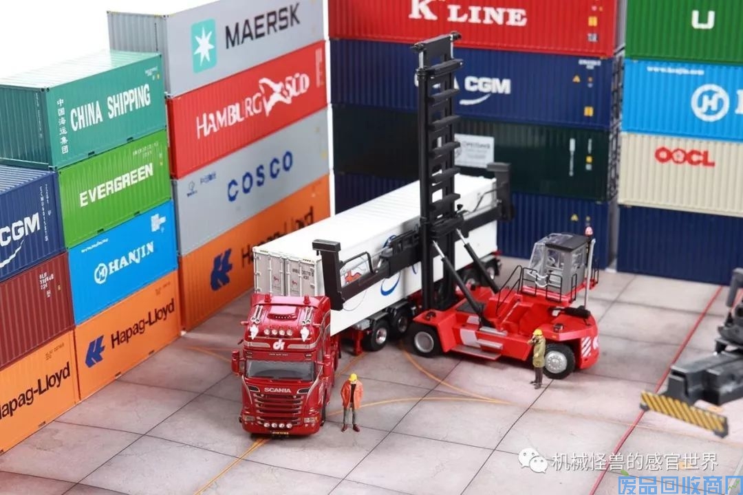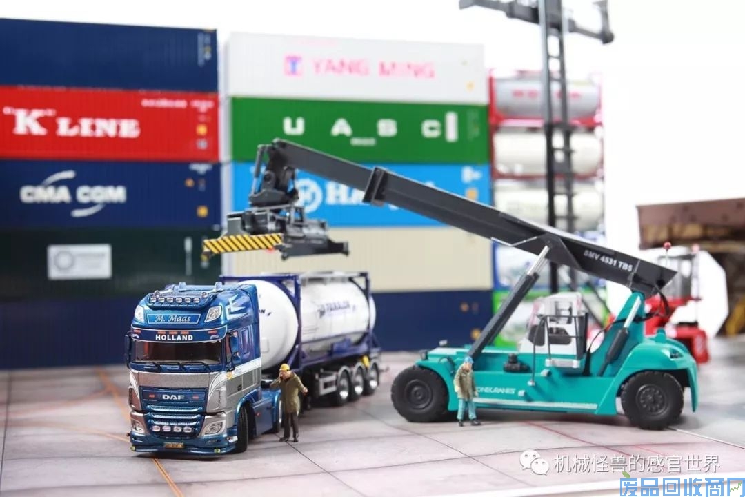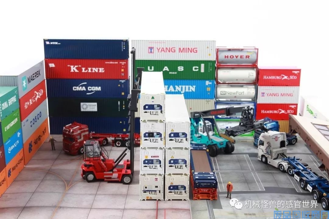 再说,集装箱模型收藏不仅仅是收藏集装箱,还有大量的周边模型,比如运输集装箱的各种卡车、挂车,搬运集装箱的各种正面吊、空箱堆高机,以及岸桥、龙门吊、穿梭跨运车、码头牵引车等等,足以掏空你的荷包,让你一入集装箱门深似海