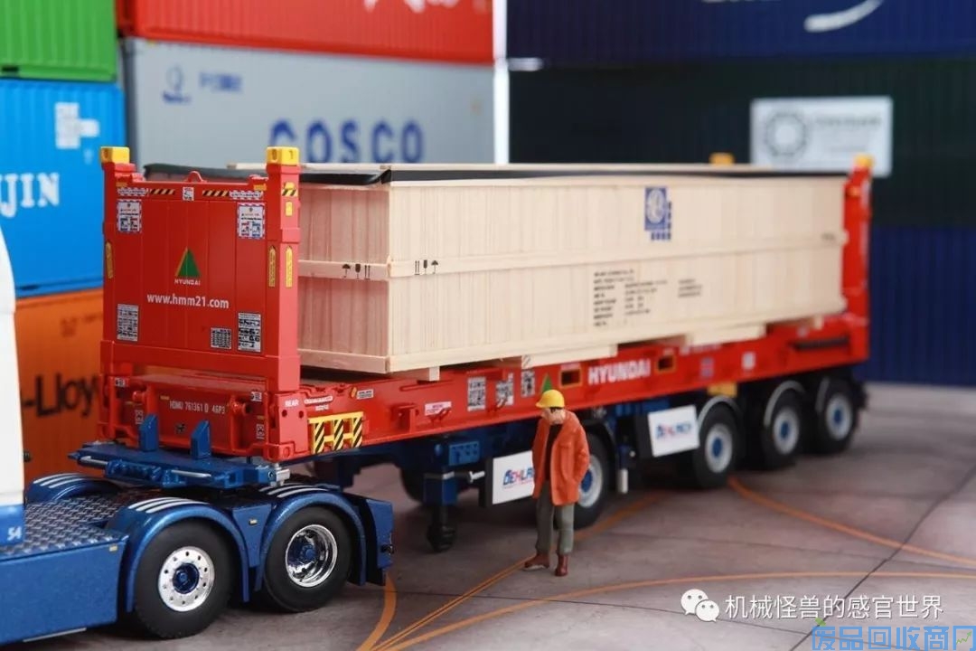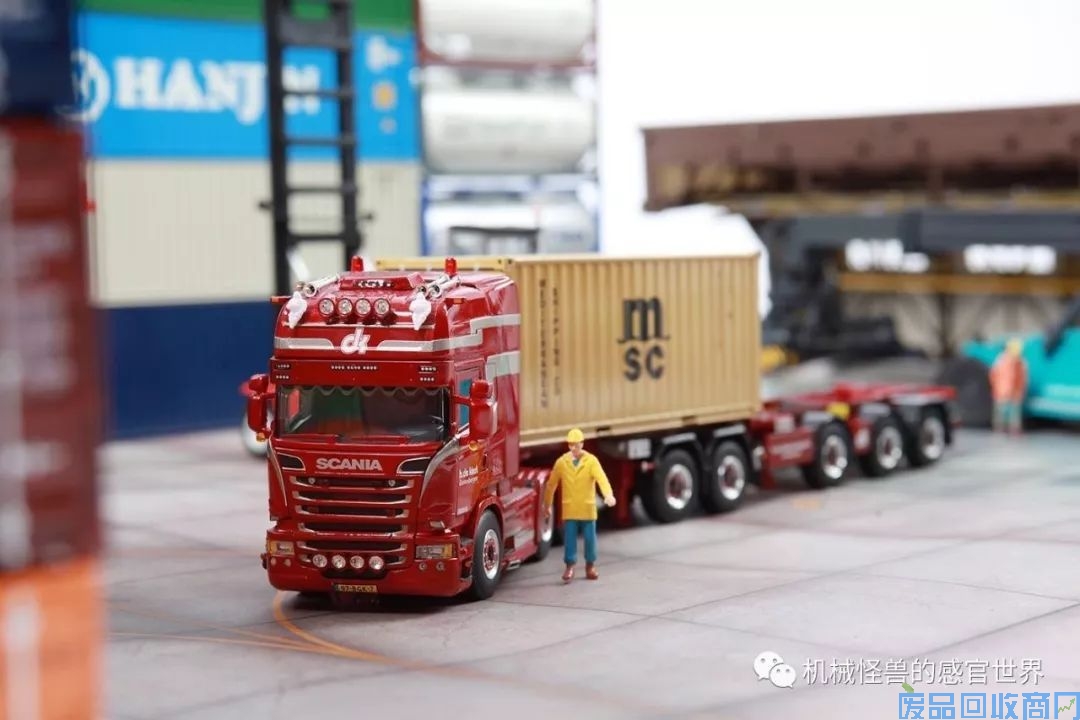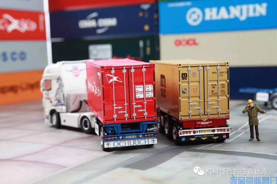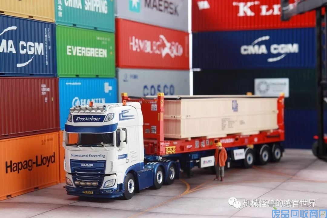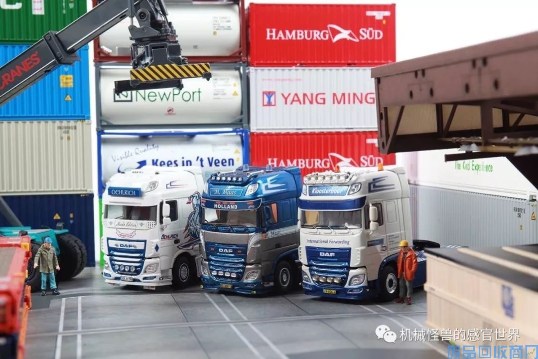 再说,集装箱模型收藏不仅仅是收藏集装箱,还有大量的周边模型,比如运输集装箱的各种卡车、挂车,搬运集装箱的各种正面吊、空箱堆高机,以及岸桥、龙门吊、穿梭跨运车、码头牵引车等等,足以掏空你的荷包,让你一入集装箱门深似海