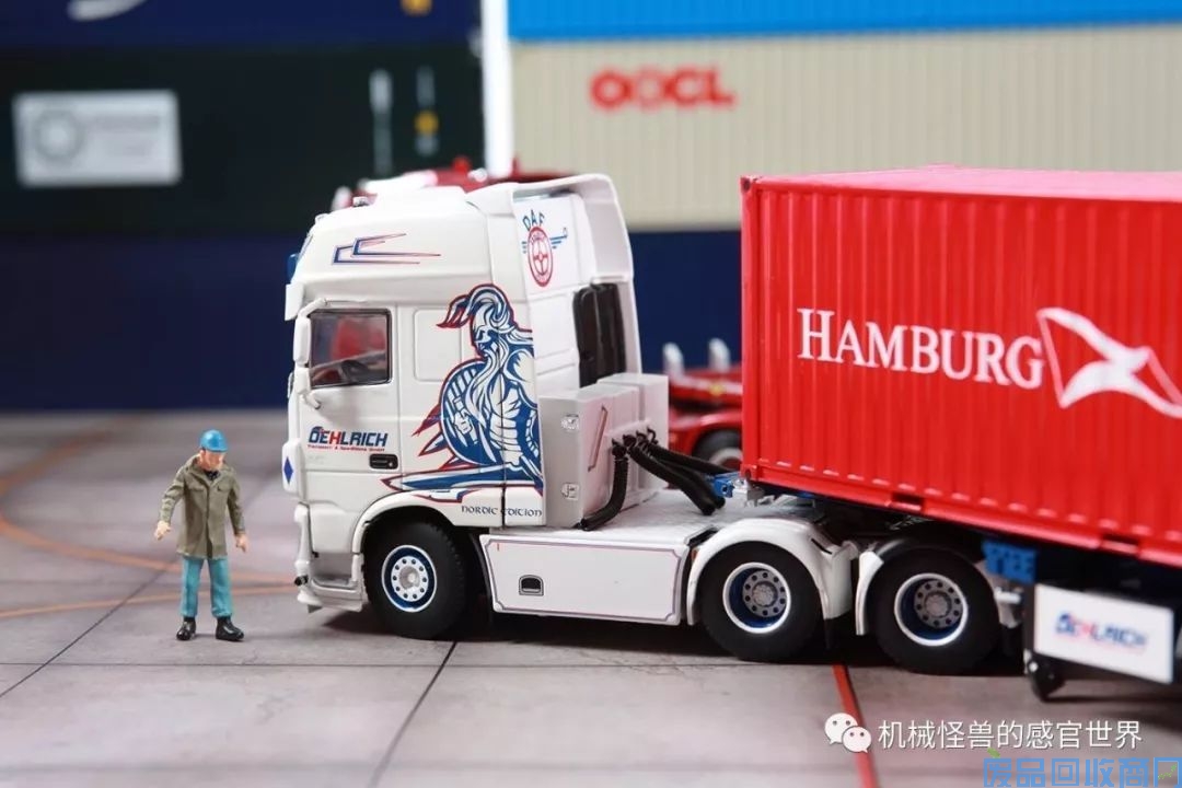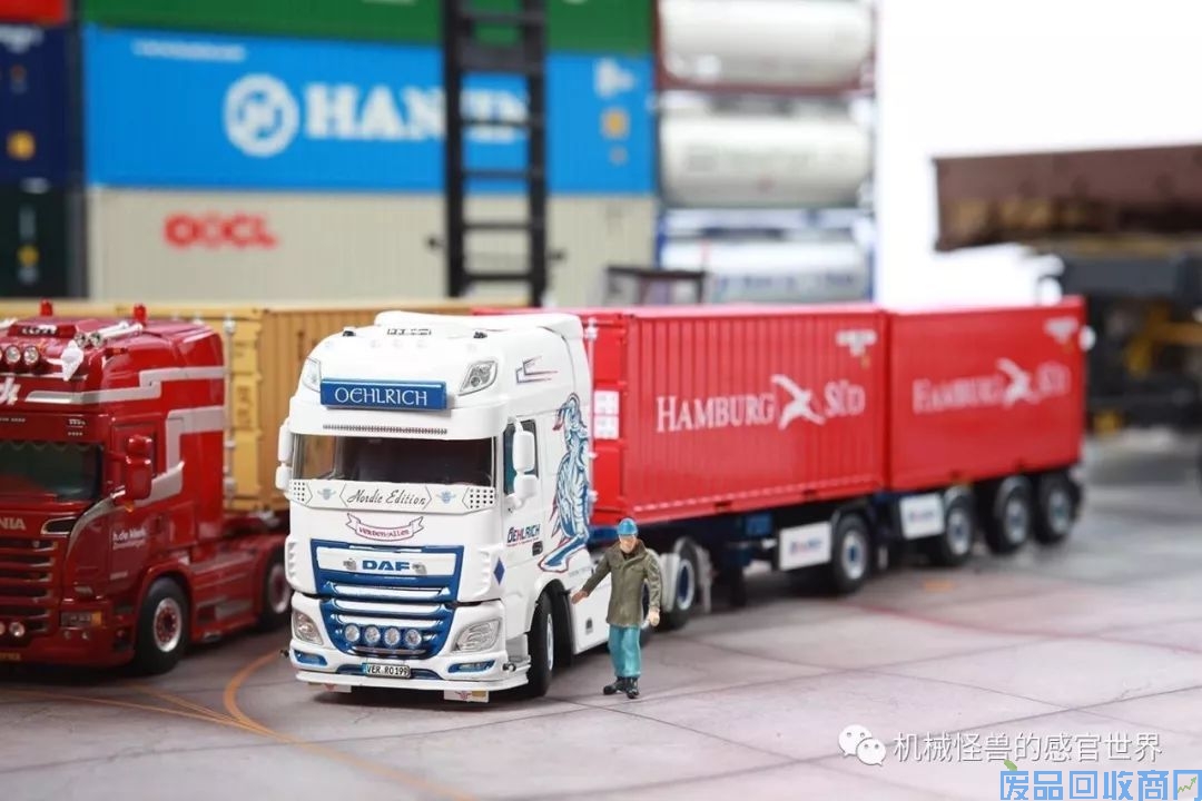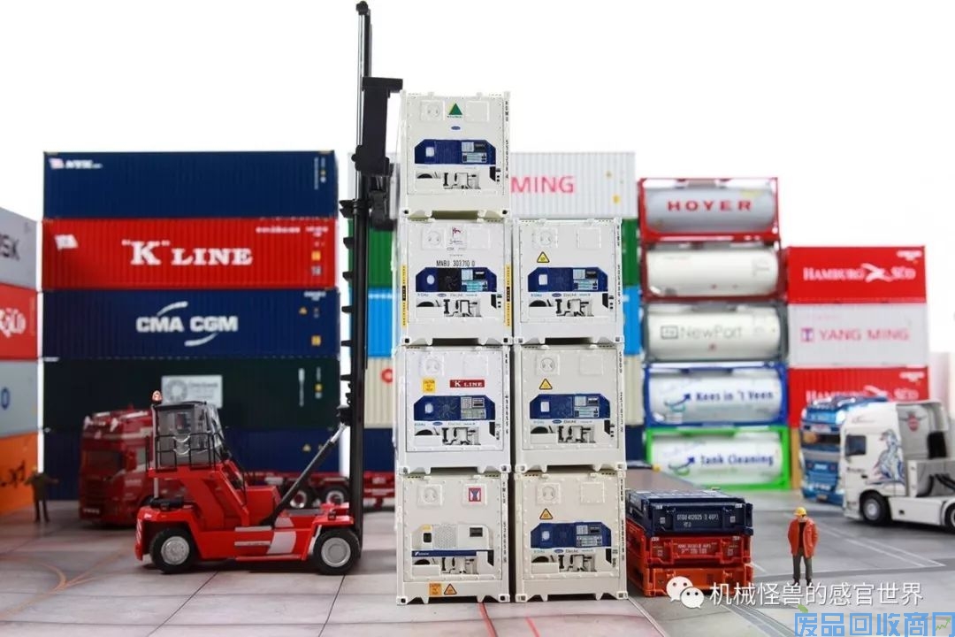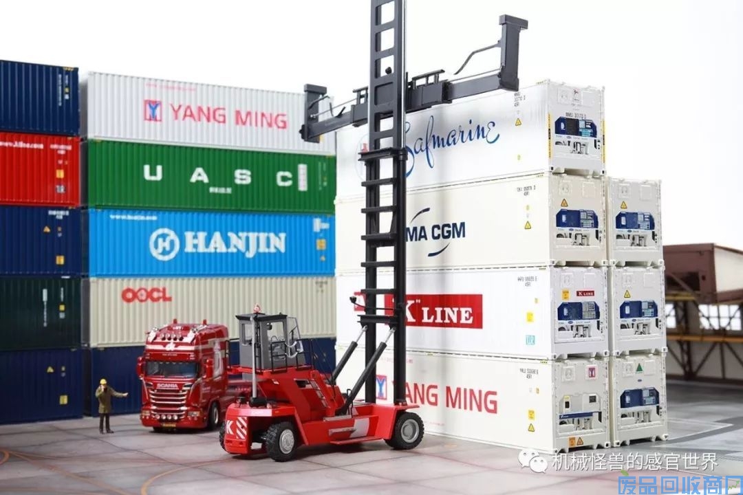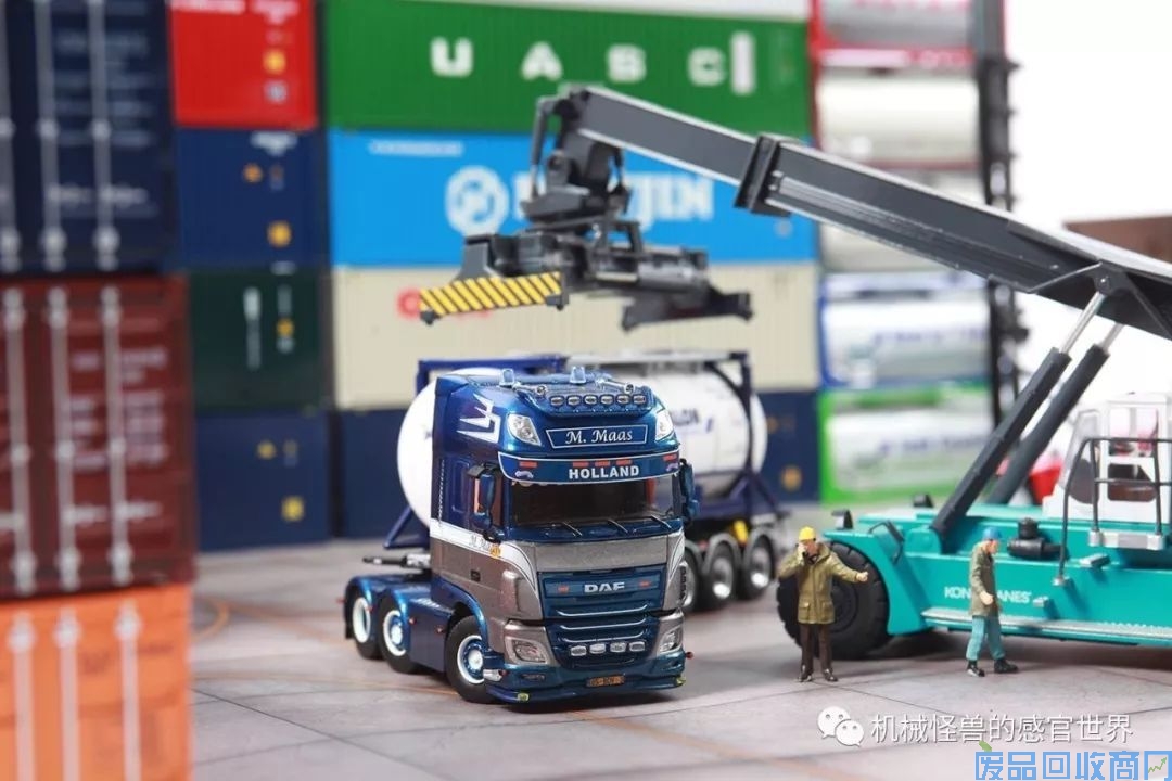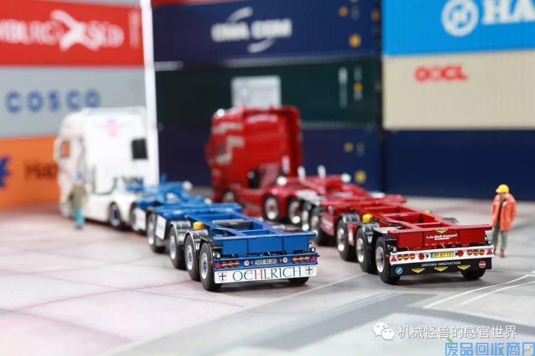 再说,集装箱模型收藏不仅仅是收藏集装箱,还有大量的周边模型,比如运输集装箱的各种卡车、挂车,搬运集装箱的各种正面吊、空箱堆高机,以及岸桥、龙门吊、穿梭跨运车、码头牵引车等等,足以掏空你的荷包,让你一入集装箱门深似海