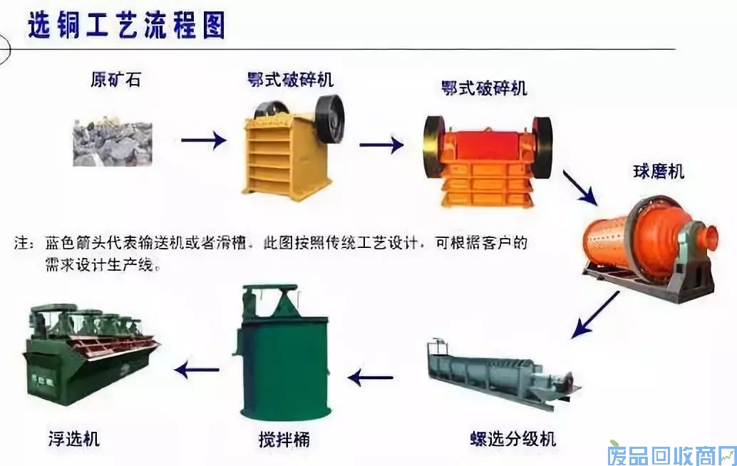 在我国云南、江西、西藏等地还是有不少铜矿的。铜矿炼铜的铜老板通过各种关系,搞到铜矿的开采权,就可以用铜矿提炼出精矿,再用精矿提炼出铜水,再用铜水做成铜管、铜板、铜锭等各种铜材。目前,铜矿炼铜、炼出精矿一般采用浮选的方式,主要工艺流程如下: