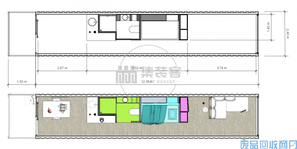 学生单元的布局经过仔细考虑,可以提供一个他们认为适合自己的房屋。集装箱的拉伸空间细分为三个部分,以产生不同的区域和气氛。一个非常私密的空间,卧室和浴室是家庭的核心,浴室实用而紧凑,床是标准的宜家产品,舒适地睡觉,可以转换成一米六的双人床,以防万一。集装箱每端的两个空间明显不同。一个是厨房和用餐区,指向庭院,它刺激了互动。相反,另一个空间为集中,沉思和放松提供了平静。
