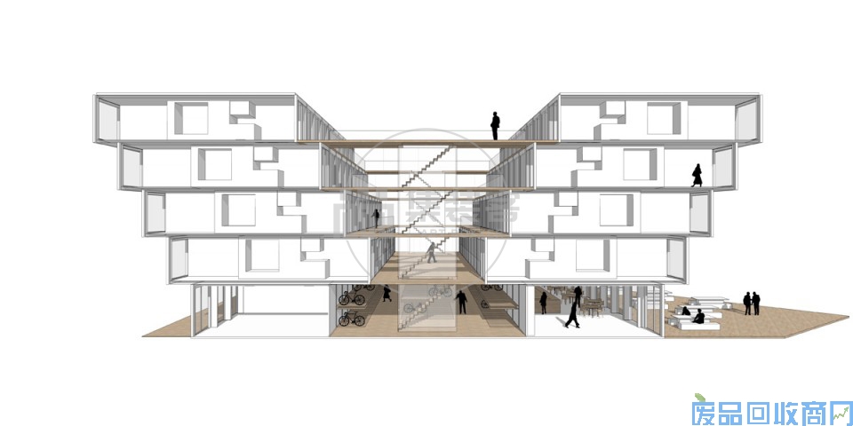 校园内最突出的街区在地面层还有一层楼。这个中央建筑可以配备一个电梯,以允许身体残疾的学生进入上面楼层的住所。一楼迎合了整个学生社区的需求。庭院可容纳400辆自行车停放,不会对校园空间产生视觉冲击。垃圾箱和存储空间也可以放在这里。根据该计划所需的面积,可以开发400平方米的商业空间。学生社区设有小商店。在对面,商业空间面向校园的中央草坪。这是阳光明媚的一面,可以摆放桌椅,不难想象咖啡馆、外卖餐厅或星巴克咖啡在这里会非常成功。