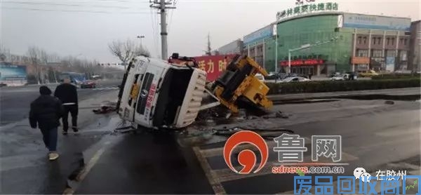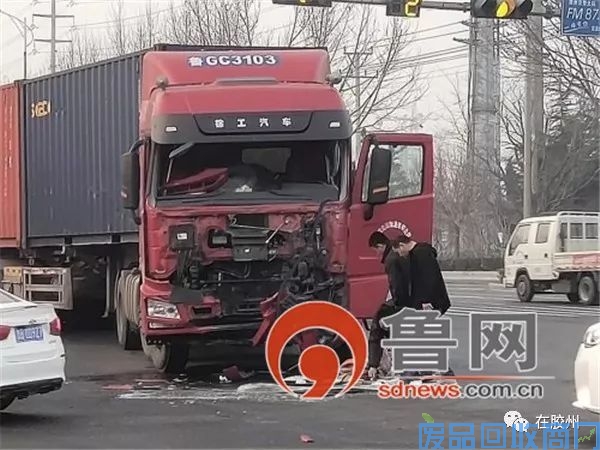 3月26日凌晨5时许,胶州市海尔大道与兰州路路口一辆集装箱车与一辆道路救援车相撞,集装箱车车头破损,道路救援车被撞翻,事故造成道路拥挤大面积堵车,庆幸的是事故没有造成人员受伤,目前事故原因警方正在调查当中。