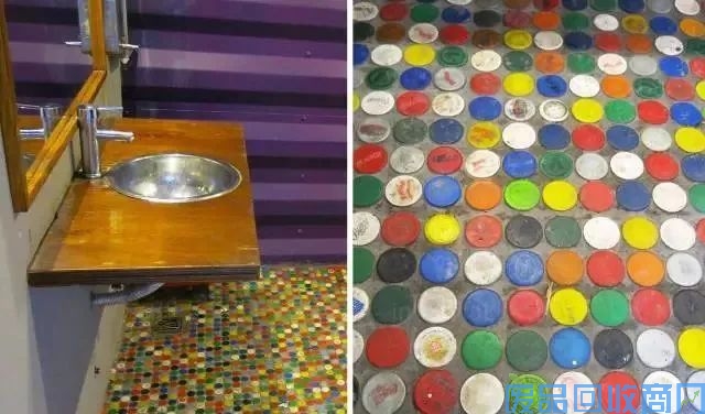 因为箱体内部无法开辟如厕空间,所以游客需要到公共卫生间去解决,卫生间内部的地板,全都由色彩斑斓的瓶盖镶嵌而成。变换用途的盆栽、一些由著名设计师Diana Cabeza设计的精美容器(聚乙烯材质),同样是卫生间内部的可持续元素。