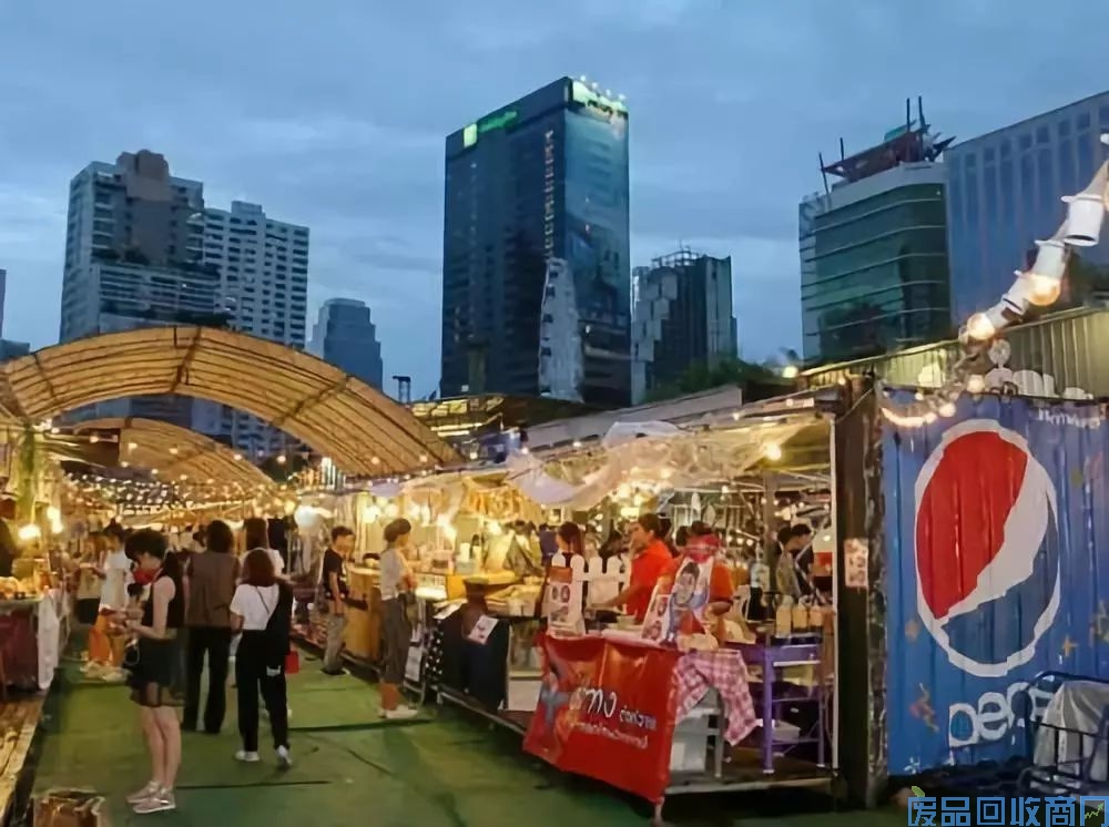 开敞的庭院周边环绕着金属框架结构以及集装箱,各种潮流款零售店及本土特色的美食餐饮店错落布置在街市中。