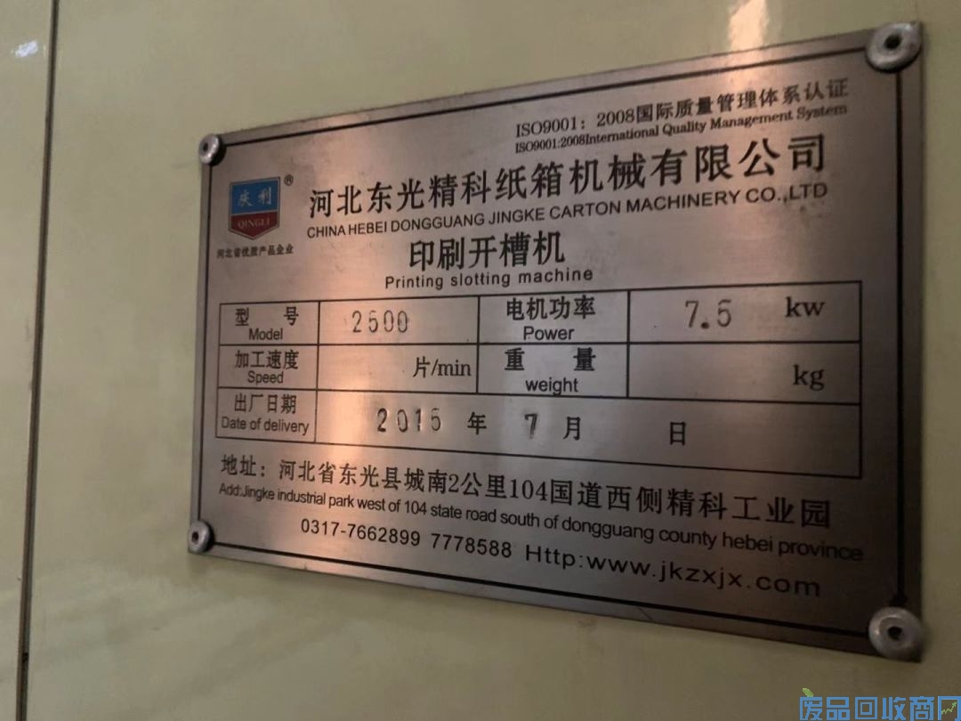 该厂设备印刷开槽机,前沿送纸机、于2015年10月到厂安装调试并运行至今,机器为河北东光县生产,状态良好,平时保养非常好。老虎机为二手设备均可正常使用,可以到厂试机。