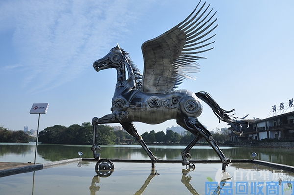 “汽车离合器件、洋铁锹、扳手,这些常见的器材,成了这匹马身体的一部分。”侯中民介绍,这匹高达3米,展开的双翼宽达2米的飞马,光羽毛就用了1000多片废弃铁片。