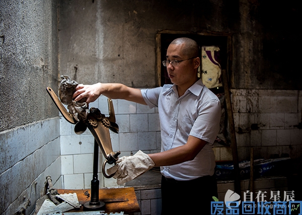 在长沙,可能没有人比侯中民更钟爱废铜烂铁了。在他眼中,一个废弃的齿轮或油箱,一把破旧的铁瓢或扳手,都是漂亮的宝贝。他总能用艺术的眼光,发掘这些废铜烂铁的价值。