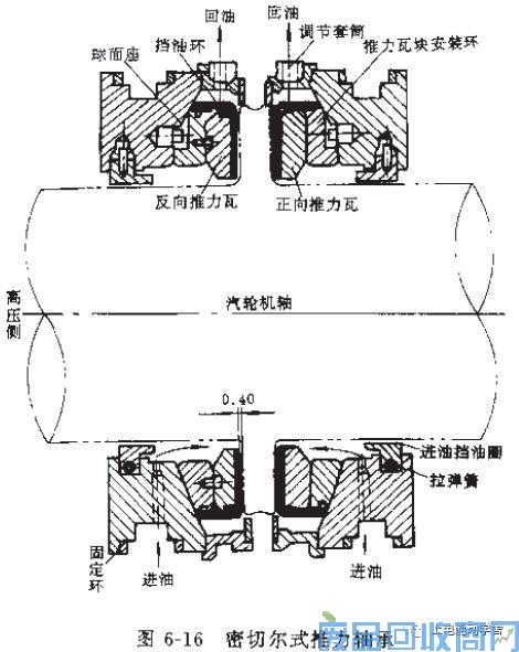 推力轴承承受蒸汽作用在转子上的轴向推力,并确定转子的轴向位置,以保证通流部分动静间合理的轴向间隙。所以推力轴承被看成转子的定位点,或称汽轮机转子对静子的相对死点。
