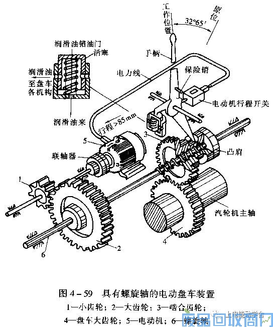 在汽轮机冲转前和停机后使转子转动,以避免转子受热和冷却不均而产生热弯曲。 盘车前盘动转子,可以检查动静部件间是否有摩擦、润滑油系统工作是否正常及主轴弯曲是否过大等,用来检查汽轮机是否具备正常启动条件。 按盘车转速高低,盘车装置可分为高速盘车和低速盘车两种。采用高速盘车时可以加快汽缸内的热交换,减小上、下缸之间及转子内部温差,缩短机组启停时间,并可以在轴承内较好的建立起油膜,保护轴颈和轴瓦。低速盘车时启动力矩小,冲击载荷小,有利于延长部件的使用寿命。