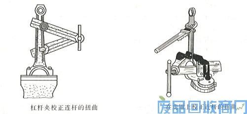 校正柴油发电机组连杆扭曲的方法,如上左图所示,将校扭曲的两根杠杆夹住连杆两边,不带螺孔的一根杠杆应放在间隙大的一边,逐渐旋紧压力螺钉,迫使两根杠杆向两边分开,渐渐将连杆反扭,边校正边检查,直至连杆校正为止。