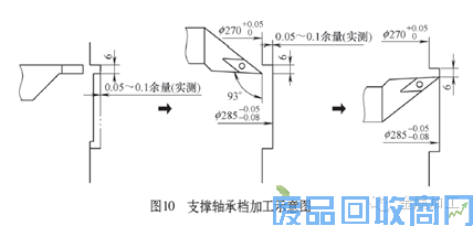 如图10所示, 先将前端φ270mm内圆按工艺要求公差控制在0~+0.05mm车出,车出后再用内径千分尺测出实际尺寸。以该内圆的实际尺寸作为基准对刀,保证0.02mm塞尺不通过,以此标准完成对刀。然后用6mm割刀(大前角、小后角、刀尖半径小的防振割刀)在φ 285mm内圆处车一段退刀槽,槽底留0.05~0.1mm余量,再用某款进口35° 菱形车刀将轴承档槽底加工出来,最后留0.05~0.1mm余量将整个槽反车出来,该刀片的刀尖圆弧为R0.4mm,有精加工的断屑槽,切削力小,振动小,能保证加工的稳定性,从而使工件尺寸精度、表面粗糙度值达到设计要求。