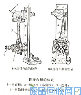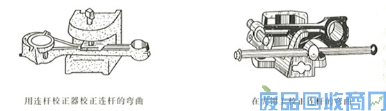 由于连杆弯曲或扭曲后有有残余应力的存在,虽然在当时是压好的,但有可能发生重复变形。为了解决这个问题,连杆经校正后,可放在机油中加温到150-200℃,以消除或减小连杆弯曲和扭曲的残余应力。当连杆的弯曲和扭曲程度很小时,校正后可不做此项工作。在没有连杆校正器的情况下,也可以利用其他简单的工具(如虎钳)进行校正,如下右图所示。