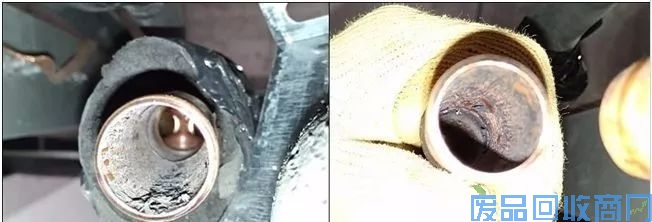 如下左图,焊接过程中没有规范操作,导致铜管内壁生成黑黑的氧化皮,而下右图安正规操作,焊接处铜管内存光亮如新,最主要是管内并无氧化皮的产生。