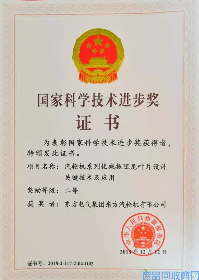东方电气集团“汽轮机系列化减振阻尼叶片设计关键技术及应用”项目获得2018年度国家科学技术进步奖二等奖。集团公司首席专家、东方汽轮机副总经理方宇,东方汽轮机技术专家范小平代表东方电气集团接受颁奖。