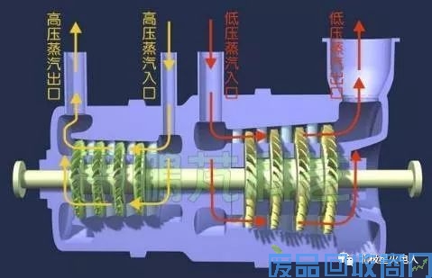 汽轮机是能将蒸汽热能转化为机械功的外燃回转式机械,来自锅炉的蒸汽进入汽轮机后,依次经过一系列环形配置的喷嘴和动叶,将蒸汽的热能转化为汽轮机转子旋转的机械能。蒸汽在汽轮机中,以不同方式进行能量转换,便构成了不同工作原理的汽轮机。