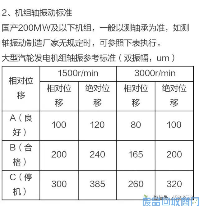 1)汽轮机转速在1500r/min时,振动双振幅50um以下为良好,70um以下为合格;汽轮机转速在3000r/min时,振动双振幅25um以下为良好,50um以下为合格。