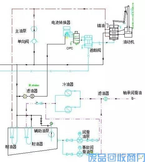 汽轮机的油系统是一套分厂完整的液压油系统,其组成:储油装置-油箱,动力单元-油泵,输送装置-管道,冷却单元-冷油器,净化单元-过滤器,控制单元-电调装置,执行单元-油动机。