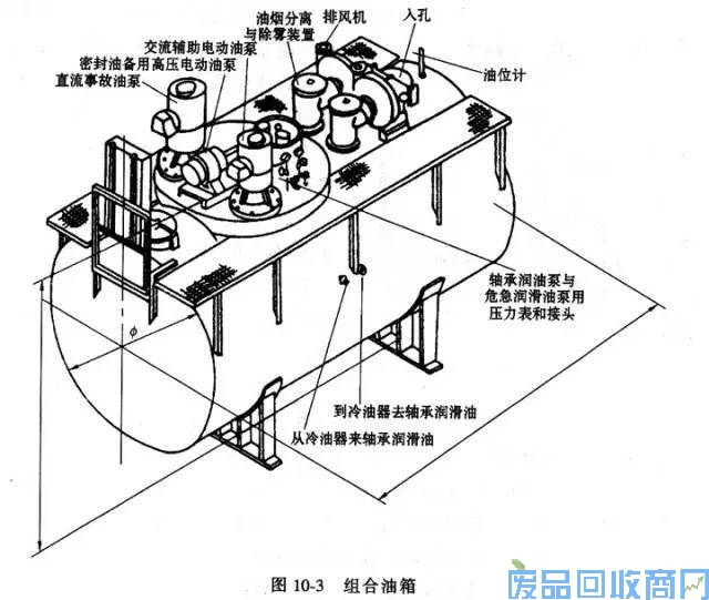机组采用集装(组合)式油箱。它是一只有效容积45.7M3的筒形卧式油箱,由钢板卷制焊接而成。油箱顶部焊有顶板,交流润滑油泵与直流事故油泵的电动机、备用氢密封油泵、排烟装置、油位指示器、油位开关等都装在顶板上。油箱内装有滤油器、交流润滑油泵、直流事故油泵、油涡轮、电加热器及连接管道、逆止阀等。油箱顶部开有人孔,装有垫圈和人孔盖,油箱底部有一法兰连接的排油孔。