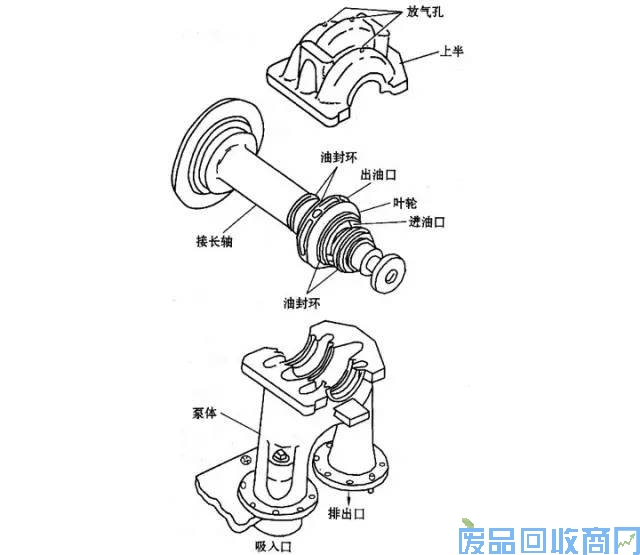 主油泵是蜗壳型离心泵,安装在前轴承箱中的汽轮机外伸轴上,与汽轮机主轴采用刚性连接,由汽轮机主轴直接驱动,以保证运行期间供油的可靠性。离心式主油泵自吸能力较差,必须不断地向其入口供给充足的低压油:在启动升速和停机期间,由交流润滑油泵向其供油;在额定转速或接近额定转速时由注油器向其供油。主油泵出口有管道与油箱内的注油器进口相连,并通过一逆止门与机械超速遮断和手动遮断油总管,以及发电机氢密封油总管相通。