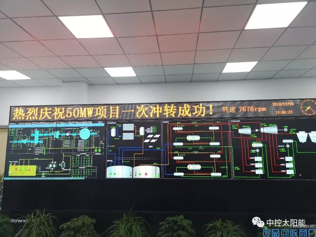 2018年12月26日19点40分,青海中控太阳能德令哈50MW塔式熔盐储能光热电站汽轮机顺利达到额定转速7676转/分,汽轮机冲转一次成功。