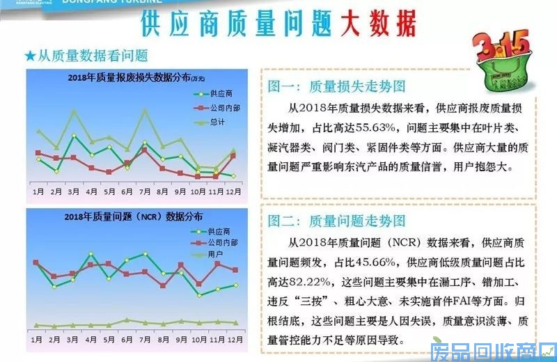 值此“3.15”(国际消费者权益日)来临之际,东汽科技质量部通过质量大数据对比反馈2018年度供应商质量状况,通过展示触犯质量红线、电厂质量问题等典型质量案例,曝光供应商弄虚作假、违规操作、管理不良等系列严重的质量事件,以此警示来者,惩前毖后。让我们以实际行动落实党的十九大精神,践行东汽“一次做好”质量方针,不断提升产品质量,推动质量变革,实现质量和效益双提升。