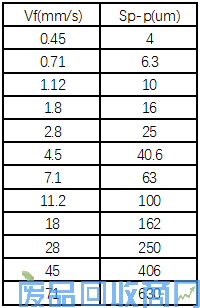 当f=50Hz时,振动速度与振动位移对应值见下表: