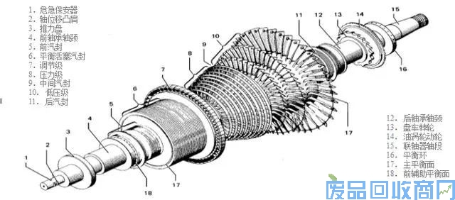 汽轮机中所有转动部件的组合体称作转子。包括:主轴、轴封、动叶片、止推盘、危急保安器、联轴器总承、测量盘等。